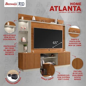 Com uma linha de produtos inovadores, A Móveis Bechara trás produções com alto nível de modernidade. O Home Atlanta é ideal para sua sala! Tem designer contemporâneo com LED elétrico embutido, agregando muito mais charme e requinte ao ambiente. Produzido em MDP, comporta TVs de até 65 polegadas. Portas com dobradiças Soft-Close e amplo espaço interno. Seus nichos são ideais para acomodar os mais variados tipos de objetos, sendo para decoração ou produtos eletrônicos. A base acompanha rodízios embutidos para facilitar a locomoção, caso necessário.