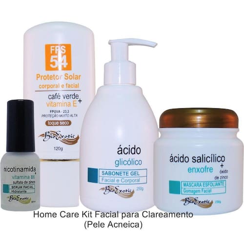 Kit Home Care Antiacne e Clareamento Facial BioexoticTratamento em casa. 1. Sabonete Ph Neutro Clorexidine 250ml2. Máscara Esfoliante Gomagem Facial Ácido Salicílico + Enxofre + Óxido de Zinco 250g3. Sérum Facial Hidratante Nicotinamida + Vit B6 + Sulfato de Zinco 30ml4. Protetor Solar FPS 54 Vitamina E + Café Verde Toque Seco 120gMODO DE USAR:A. Lavar o rosto com o Sabonete Neutro de Clorexidine. Retirar com bastante com água ou gaze umedecida em água.B. Em dias alternados aplicar uma fina camada da Gomagem Facial máscara esfoliante deixar agir alguns minutos deixar secar . Friccionar com a ponta dos dedos, esfregando aos poucos todas as regiões do rosto. Retirar o restante com água ou gaze umedecida em água .C. Aplicar o Sérum Facial de Nicotinamida, Zinco e Vit. B6 em toda face até a absorção total do produto.D. Aplicar o Protetor Solar FPS 54 em toda face para finalizar o tratamento.