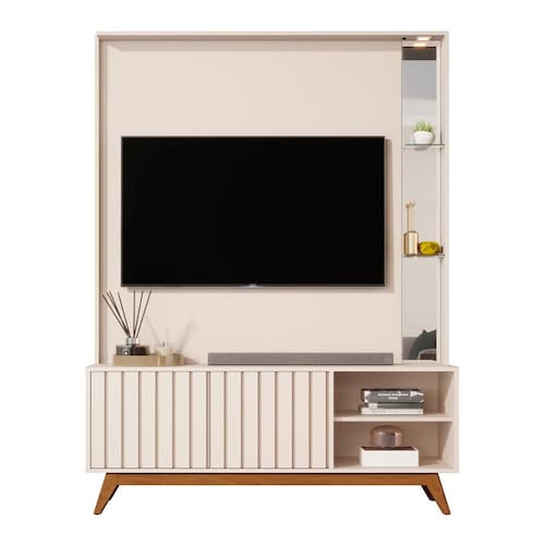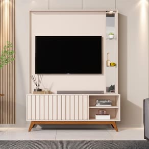 Compacto e sofisticado, comporta TVs de até 60 e traz 2 portas ripadas, prateleiras de vidro e espelho que ampliam o ambiente.