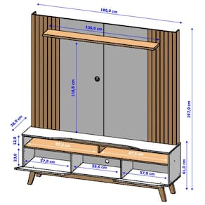 Material da estrutura: Estruturado em MDP 15mm, Prateleira superior 25mm e Portas e Painéis frisados em MDF 15mm, com pés em madeira maciça;