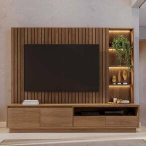 Adequado para TVs de até 82 polegadas, o home possui nichos decorativos com led, nicho inferior para aparelhos, duas gavetas com corrediças telescópicas e dois gavetões laterais, oferecendo uma solução completa para armazenamento.