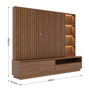 Com linhas retas e iluminação quente, o móvel destaca-se pelo painel superior com ripas largas, proporcionando uma sensação de volumetria.
