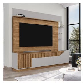 Home Dallas, uma misto de elegância e modernidade. Robusto, ele possui largura de 2,1 metros, é o móvel ideal para sua sala! Ele conta com detalhe decorativo ripado que se estende até sua porta, que possui dobradiças com sistema softclose e fecho clique magnético. Gaveta e Porta direita em MDF chanfrado que proporcionam o produto um design único. Ele possui corrediça telescópica reforçada. 3 Prateleiras sendo a superior em 25mm, amplo espaço para TV, comportando TVs de até 75 polegadas.