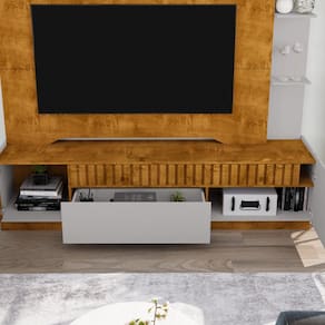 Home Dallas, uma misto de elegância e modernidade. Robusto, ele possui largura de 2,1 metros, é o móvel ideal para sua sala! Ele conta com detalhe decorativo ripado que se estende até sua porta, que possui dobradiças com sistema softclose e fecho clique magnético. Gaveta e Porta direita em MDF chanfrado que proporcionam o produto um design único. Ele possui corrediça telescópica reforçada. 3 Prateleiras sendo a superior em 25mm, amplo espaço para TV, comportando TVs de até 75 polegadas.