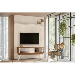 A Composição Frizz New Premium combina estilo moderno e praticidade, sendo fabricada com estrutura em MDP e MDF de 12, 15 e 25mm, revestida com pintura UV de alta qualidade, que proporciona resistência e elegância. Suas dimensões incluem um rack de 1,500 x 0,675 x 0,390m e um painel de 1,790 x 2,445 x 0,185m, ambos projetados para acomodar TVs de até 65 polegadas, com entradas específicas de 1,500 x 0,385m no rack e 1,790 x 1,200m no painel. O painel apresenta um sofisticado frisado em MDF com design em baixo relevo, enquanto o rack conta com duas portas deslizantes frisadas que se sobrepõem, duas prateleiras e puxadores funcionais que garantem organização e praticidade. Os pés retrô adicionam um toque de charme ao conjunto, conferindo estabilidade e um design atraente. O sistema de montagem Girofix facilita a instalação, tornando a Composição Milo uma escolha inteligente para quem deseja um ambiente moderno, funcional e elegante.