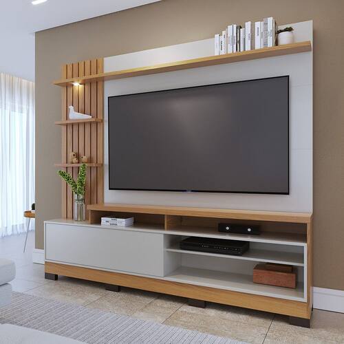 Com detalhes ripados iluminados por spot de led em seu painel, o Home Theater Maceió é um móvel super versátil, que combina tanto com ambientes modernos e minimalistas, quanto os clássicos. Possui quatro nichos com espaço para acomodar aparelhos eletrônicos e objetos decorativos e uma porta basculante com o sistema de pistão a gás, que garante suavidade em sua abertura. É um móvel ideal para quem deseja ter um verdadeiro cinema em casa, pois seu painel suporta TVs de até 65 polegadas.