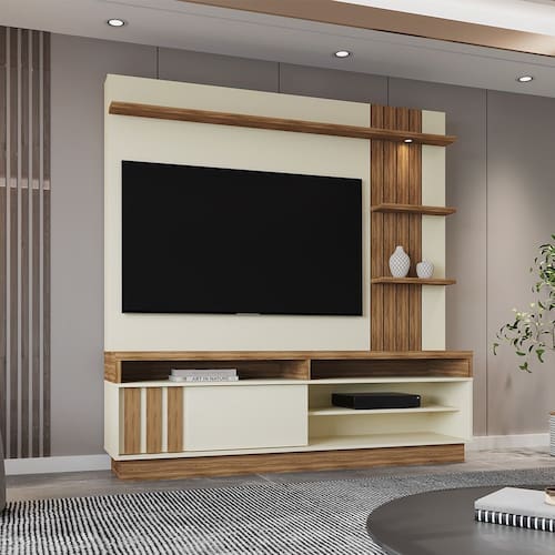 Características: Estrutura em MDP Pintura UV 01 Porta de correr com detalhes ripados Painel ripado Acompanha luz de LED Possui prateleiras com amplo espaço Ideal para TVs de até 55 polegadas Suporta até 45kg