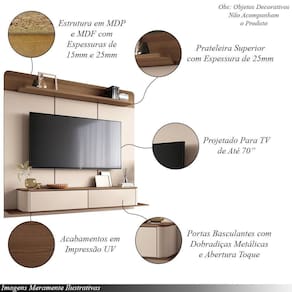 O Home Painel Decorativo Suspenso Messier é a escolha perfeita para quem deseja um ambiente sofisticado e funcional. Projetado para TV de até 70 polegadas, ele possui um design elegante com linhas retas e cantos arredondados. Suas 2 portas basculantes, com dobradiças metálicas e sistema de abertura fecho toque, garantem um fechamento suave e silencioso, proporcionando praticidade. A prateleira superior, com espessura de 25mm, é ideal para acomodar objetos decorativos ou equipamentos eletrônicos. Produzido em MDP e MDF de alta qualidade, com espessuras de 25mm e 15mm, o Home Messier combina resistência e durabilidade. Esse painel suspenso traz modernidade e organização ao seu espaço, sendo ideal para salas de estar que buscam uma estética contemporânea e bem planejada.