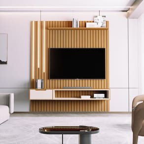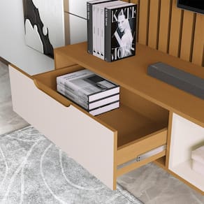 As prateleiras integradas oferecem espaço ideal para exibir seus objetos decorativos e equipamentos eletrônicos, criando um ambiente moderno e organizado.