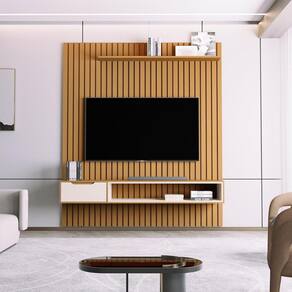 As prateleiras integradas oferecem espaço ideal para exibir seus objetos decorativos e equipamentos eletrônicos, criando um ambiente moderno e organizado.