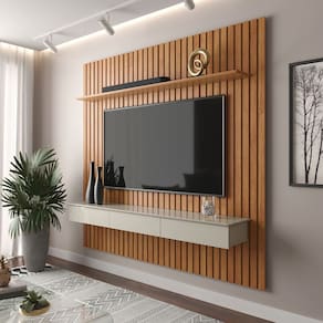 Compatível com TVs de até 55 polegadas, o modelo conta com um painel ripado que adiciona textura e sofisticação ao espaço, tornando-se o destaque da sala de estar.