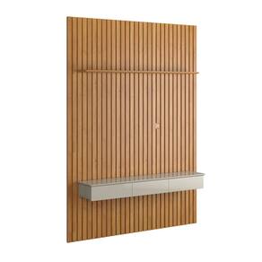 Compatível com TVs de até 75 polegadas, o painel ripado em mdf e mdp usinados, adicionando textura e um toque contemporâneo ao ambiente.