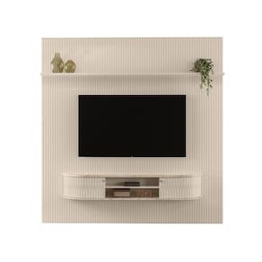 Características: Estrutura em MDP Pintura semi brilho Portas deslizantes em MDF Puxadores em Poliestireno Painel e bancada devem ser fixados na parede Tampo e base com detalhes curvos Espaço para TV até 75 Polegadas.