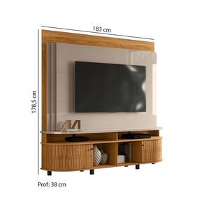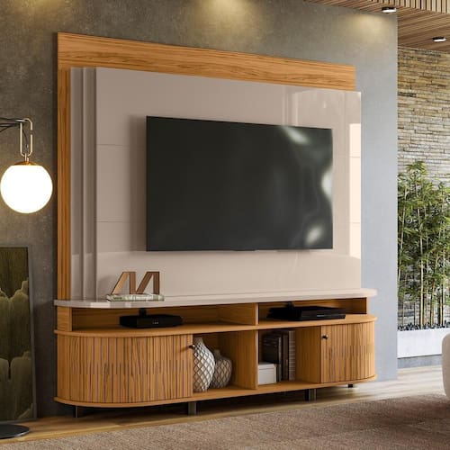 Características: Estrutura em MDP Pintura com acabamento UV 02 Portas flexíveis em MDF Puxadores Poliestireno Cromado Pés em Poliestireno Detalhes em Painéis Sobrepostos Suporta TVs de até 65" Tampo e Base com Detalhes Curvos Ninchos com Amplo Espaço