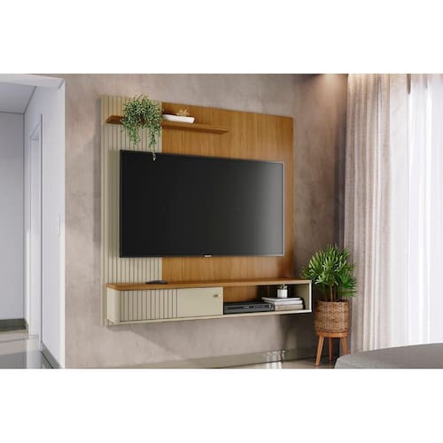 A estrutura é fabricada com painéis de MDP de 15 e 25 mm, oferecendo resistência e durabilidade. Projetada para ser fixada diretamente na parede, a bancada Aurora permite que o televisor seja instalado no painel integrado, garantindo um visual organizado e funcional. Suporta TVs de até 65"", atendendo às necessidades de diversos tamanhos de aparelhos.