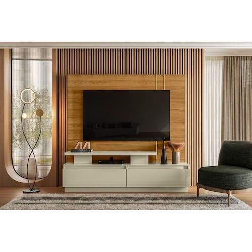 """A New Apolo é ideal para TVs de até 75 polegadas, oferecendo funcionalidade e design moderno. Fabricada em MDP com revestimento em pintura UV e acabamento em Hot Stamping, conta com dimensões de 1,830m x 1,760m x 0,405m e suporte para até 65 kg distribuídos.