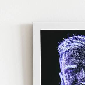 A imagem, que retrata a fotografia de um homem na neve azul, foi impressa com qualidade superior, garantindo cores vibrantes e uma reprodução fiel dos detalhes da foto. A composição visual é enriquecida pela moldura branca, que cria um contraste marcante, permitindo que a imagem se destaque ainda mais na parede.