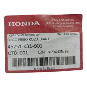 Honda CBX 250 Disco Freio Dianteiro Genuíno Ncm: 87083090 Origin Detail: Reseller Peças Genuínas De Reposição. São Fabricadas Com Tecnologia Que Oferece Segurança, Desempenho E Durabilidade. Todos Os Nossos Produtos Possuem Legal. É Recomendado Que A Instalação Seja Feita Por Qualificado. Ao usar peças genuínas Honda, você garante que seu veículo se mantenha Da mesma maneira em que saiu da fábrica Descrição Do Produto: Honda CBX 250 Disco Freio Dianteiro Genuíno Aplicação: Honda CBX 250 TWISTER. 2016 Em diante Código Sku: RMDI20201117 Código Fabricante: 45251K31901 Op:dp Marca: Honda genuíno : padrão Data: 2025-08-27 Conteúdo da Embalagem: 1 UND de disco de freio Dimensões em cm Altura x Comprimento x Largura : 3.0x26.0x26.0 Peso kg : 3.0 Código SKU: RMDI20201117 Código do Fabricante/Referência: 45251K31901 Marca: Não Informado Ean: 7899716815175