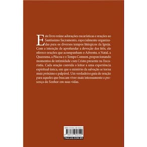 Este livro traz impresso em um único manual um conjunto de horas santas organizadas em um prático roteiro de adoração. É um valioso instrumento para os adoradores e adoradores do Santíssimo Sacramento e todos aqueles que buscam estar em sintonia com a adoração eucarística, a fim de vivenciar diante de Jesus sacramentado os momentos fortes da liturgia no decorrer do ano litúrgico. Que o conteúdo bíblico, as preces dialogadas e os cânticos das diversas horas santas deste roteiro de adoração levem a uma maior união com Cristo e ajudem a colocar a Eucaristia no centro da nossa vida pessoal e comunitária. Marca: Não Informado