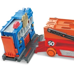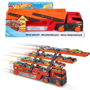 O Hot Wheels Mega Hauler é um grande equipamento para grandes aventuras, com infinitas possibilidades de contar histórias. Este caminhão enorme pode carregar até 50 carros em seus seis níveis expansíveis! Na parte de trás do caminhão há uma rampa que desce para se conectar aos conjuntos Hot Wheels City. A cabine do equipamento abre com espaço para colocar mais 2 veículos e o painel lateral transparentes abre para que as crianças possam guardar seus carrinhos favoritos em um local especial. Com recursos incríveis é um ótimo presente para crianças e colecionadores! Seis níveis expansíveis podem transportar até cinquenta veículos em escala 1:64! A rampa dobrável na parte de trás do equipamento permite que as crianças se conectem aos conjuntos Hot Wheels City. Não acompanha pistas e nem carrinhos. Pistas e Carros vendidos separadamente.