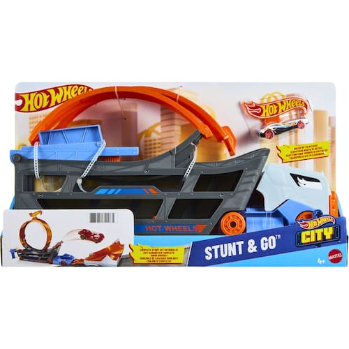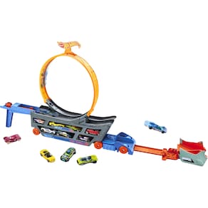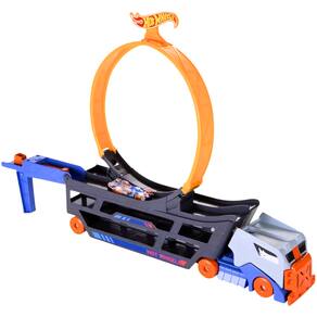 Descrição do produto : Essa incrível plataforma comporta até 18 carros, mas veja novamente, não é um caminhão comum, é um conjunto móvel, o primeiro caminhão com loop! Você pode encaixar os dois lados do loop no lugar e girar o lançador dobrável, depois puxar a cabine na frente para criar um salto dramático. Você pode lançar através do loop e aterrissar o salto várias vezes, ou adicionar mais pistas para um salto ainda mais longo. O transportador transformador Set de Acrobacias é totalmente portátil para a ação de acrobacias em qualquer lugar, a qualquer hora! Você pode dobrar todo o conjunto, carregar seus carros na caçamba do caminhão e sair rolando até o seu próximo show de acrobacias Hot Wheels. Cada um é vendido separadamente, sujeito à disponibilidade. As cores e as decorações podem variar. :