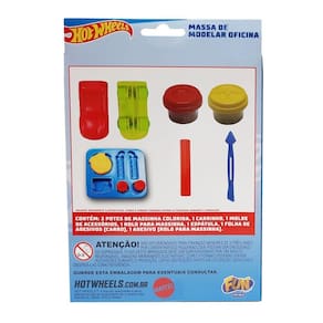 Contém: Moldes de oficina hot wheels e 5 massinhas de modelar coloridas.