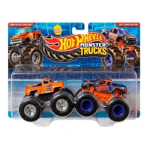 Cada pacote surpresa Hot Wheels Monster Trucks contém 2 veículos diferentes.