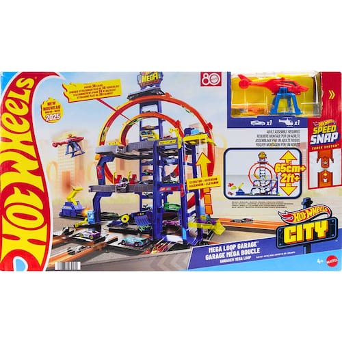 Descrição do produto : O conjunto de brinquedos Hot Wheels City Mega Garagem tem três níveis de brincadeiras centradas no carro para envolver os jovens pilotos em narrativas imaginativas e acrobacias épicas. No piso da base desse conjunto de vários níveis, as crianças podem dirigir seu carro em um lava-rápido que apresenta um rolo de espuma móvel e uma cortina de lavagem. Em seguida, você pode carregar o carro no lançador e enviá-lo para o loop duplo, onde os desviadores ajudam a guiá-lo até o andar desejado. Você pode usar um elevador movido por crianças ou usar o helicóptero de transporte de carros para transportar os veículos para qualquer nível para estacionamento. A brincadeira pode ser ampliada usando os conectores Pista Speed Snap. Um carro de brinquedo die-cast da Hot Wheels e um helicóptero de brinquedo estão incluídos. Veículos e pistas adicionais são vendidos separadamente. As cores e as decorações podem variar. :