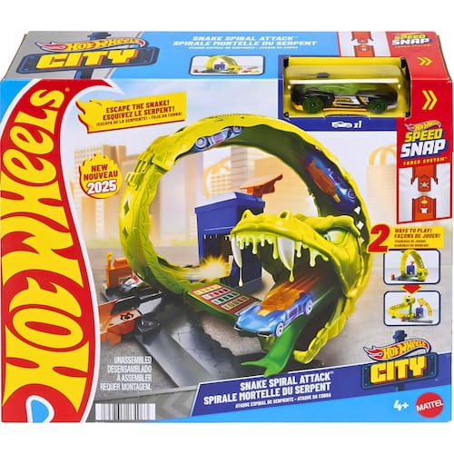 Descrição do produto : Corra e faça acrobacias no Playset Ataque em Espiral da Cobra Hot Wheels, que apresenta uma enorme nêmesis cobra e duas maneiras de brincar! Dirija até o set e reabasteça nas bombas de gasolina com mangueiras ajustáveis, depois vá até o minimercado que também é um lançador secreto. Bata no lançador com força suficiente para lançar os carros em alta velocidade pela boca da cobra e evitar ficar preso e ser devorado. Quando eles forem pegos, puxe a cobra e coloque os carros na pista de carroceria para fazê-los derrapar nas curvas. Um carrinho de brinquedo Hot Wheels está incluído e há estacionamento para dois veículos adicionais na base. (Carrinhos adicionais são vendidos separadamente.) : Detalhes técnicos : Marca: Mattel : Referência: JBM63 : Idade recomendada: 3 : Material: Plastico : Ean: 194735264063 : Peso (kg): 0,70 : Dimensões aproximadas da embalagem: 30 x 25 x 9 cm :