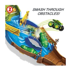 Descubra quem é o Monster Truck mais rápido e mais resistente enquanto eles competem no Hot Wheels Monster Trucks Wreckin' Raceway! Inspirado nas épicas corridas de downhill da série do YouTube Hot Wheels Monster Trucks, Bigfoot e Gunkster se esmagam e caem montanha abaixo, sobre carros esmagáveis e através de uma sequência de obstáculos para explodir através da caverna para reivindicar a cobiçada Copa dos Campeões. Primeiro caminhão sobre a ponte desencadeia uma 'explosão', fazendo o segundo lugar e o locutor voar. O conjunto dobra para portabilidade e fácil armazenamento. As cores e enfeites podem variar.