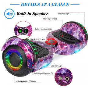 O Hoverboard FLYING-ANT 6,5" na vibrante cor B03 Galaxy Purple combina tecnologia, segurança e design sofisticado, proporcionando uma experiência de condução divertida e estável para crianças e iniciantes. Equipado com motores duplos Hub, iluminação LED futurista nas rodas, frente e traseira, e alto-falante integrado, permite se deslocar com estilo e ouvir música sem a necessidade de fones. Com certificação UL2272, este modelo garante segurança total, oferecendo controle estável e fácil aprendizado de equilíbrio. Suportando usuários de 20 a 90 kg, com alcance de até 6 milhas e autonomia de 30 a 60 minutos após 3 a 5 horas de carregamento, o hoverboard alia performance, robustez e diversão. Ideal para presentes, lazer ou momentos de entretenimento em família, ele une design arrojado e funcionalidade em cada detalhe.