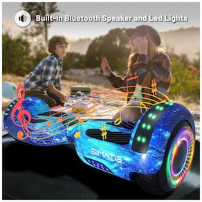 O Hoverboard SIMATE com longa duração de bateria é equipado com um sistema de auto balanceamento, dois motores de 250W, pneus todo terreno, ideal para crianças, adultos, meninas e meninos. Fácil de aprender e usar, com alto falantes Bluetooth, luzes de LED brilhantes e rodas piscantes para uma condução segura e divertida. Controle via aplicativo exclusivo XsCar para ligar/desligar, ajustar luzes, monitorar velocidade e bateria, definir modos de velocidade e muito mais. Possui rodas de 6,5 polegadas, estrutura de alumínio resistente, plataforma antiderrapante, motores duplos de 250W com velocidade máxima de 12 km/h, 3 modos de velocidade ajustáveis, alcance de até 12 km e carga máxima de 100 kg. Perfeito para crianças, adultos, meninas, meninos. Um ótimo presente para aniversários e festivais.