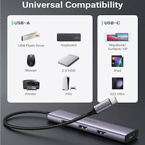 Design compacto e portátil: O adaptador UGREEN USB-C para 4 portas USB 3.0 possui um design leve e compacto, facilitando o transporte e garantindo que você possa expandir a conectividade do seu dispositivo onde estiver;