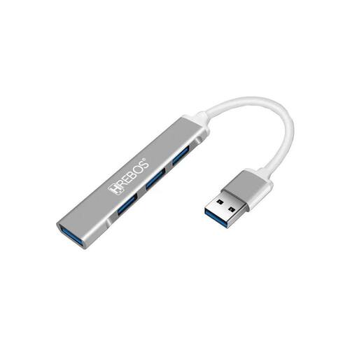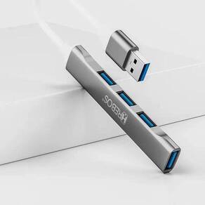 Marca: Hrebos. Cor: Prata com branco. Conector: Entrada: USB. Conectores: Sáida: 4x USB. Dimensões Produto: = 7 x 17 x 95 mm. Dimensões Embalagem : = 140 x 65 x 17 mm. Peso Produto: = 20g. Peso com embalagem: = 40g. Material: Alumínio e Cobre com revestimento em PVC.