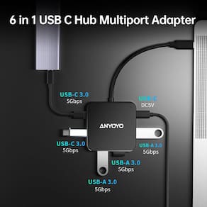 Adaptador multiporta de hub USB C 6 em 1 ANYOYO Uma porta USB tipo C se expande para as portas USB-A e USB-C. Carregar seu laptop e, ao mesmo tempo, fornecer energia a cada dispositivo externo conectado. Características: 3 portas USB-A 3.0 (até 5 Gbps, saída 5 V/0,9 A) 2 * porta USB-C 3.0 (até 5 Gbps, saída 5 V/0,9 A) 1 * Porta de fonte de alimentação USB-C (DC/5 V) Luz indicadora de trabalho Requisitos do sistema compacto e portátil: ows 7/8/10/11 ou superior macOS 10.3 ou superior Linux Conteúdo do pacote: 1 * Hub USB C 6 em 1 do usuário Manual