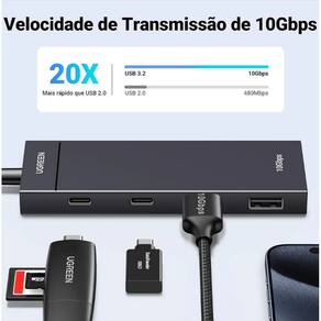 Transforme uma única porta USB-C em 4 conexões de alta velocidade com o hub USB-C 4 portas UGREEN CM806. São 2 USB-C 3.2 Gen 2 + 2 USB-A 3.2 Gen 2, ideais para notebooks, tablets e smartphones. Elimine a falta de portas e conecte todos os seus periféricos com facilidade.