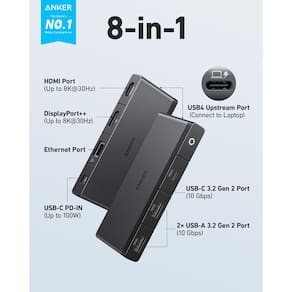 - Expansão 8 em 1: equipado com uma porta upstream USB4, uma porta PD-IN USB-C de no máximo 100 W, Porta USB-C 3.2 Gen 2 de 10 Gbps, duas portas USB-A 3.2 Gen 2 de 10 Gbps (10 Gbps), uma porta HDMI 8K, uma DisplayPort++ de 8K e uma porta Ethernet.