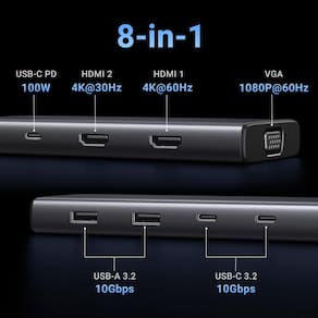 - Docking Station USB C 8 em 1: inspire mais potencial da porta USB-C do seu laptop com duas portas HDMI, uma porta VGA, duas portas USB-C 3.2 Gen 2 de 10 Gbps, duas portas USB-C 3.2 Gen 2 de 10 Gbps 2 portas, fornecimento de energia de 100W.