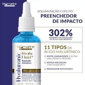 Biomarine Hyalu Fluid 11 é um reparador antissinais ultra inovador e potente porque é composto por 11 moléculas diferentes de Ácido Hialurônico, capazes de atuar desde as camadas mais superficiais até as mais profundas da pele, reparando os sinais de envelhecimento e preenchendo as linhas de expressão.Além disso, a alta carga de Ácido Hialurônico associada às diversas vitaminas do complexo B (como B1, B2, B3, B5, B9) e ao ativo Madecassoside, promove a reparação e estímulo para a produção de Colágeno!Um produto ideal para todos os tipos de pele, inclusive as sensíveis, pois é produzido com 100% de Água Termal.Benefícios e características:- Reparador antissinais- Repõe diariamente o ácido hialurônico perdido- Rápida absorção. Toque seco- Antirrugas- Ideal para todos os tipos de pele- 302% de aumento da produção de ácido hialurônico ATIVOS:- Madecassoside- 5 Minerais associados- Bioestimulador de Ácido Hialurônico- Vitaminas B1, B2, B3, B5, Bo B12- Pantenol- Silício- Água Thermal Modo de usar: Após higienizar a face com o sabonete, aplicar o Hyaluronic Hyalu Fluid sobre toda a face e massagear até completa absorção. Aplicar duas vezes ao dia.