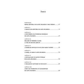 O poder de Santa FilomenaA Serva de Deus Maria Luísa de Jesus teve a graça de ouvir a própria Nossa Senhora revelar a poderosa intercessão de Santa Filomena: "A Filomena, nada se nega; sejam-lhe concedidas todas as graças." São João Maria Vianney consagrou-se à Santa Filomena e recomendava sua devoção para todos que lhe procuravam: "É a princesa do Paraíso, a quem nada é negado." "Ide a Santa Filomena e ser-vos-à feito o que pretendei, e agradecei a ela tudo o que receberdes"Ide a Santa Filomena Este santo conselho se dirige também a cada um de nós. Para oferecer todos os caminhos e os meios para uma vivência plena desta devoção surgiu este livro, o mais completo publicado no Brasil: historias, sacramentais, testemunhos, consagração, quaresma e muitas orações. Experimente também a poderosa intercessão de Santa Filomena. Faça a experiência: Ide a Santa Filomena Marca: Salve Maria Salve José Ean: 9786587013084