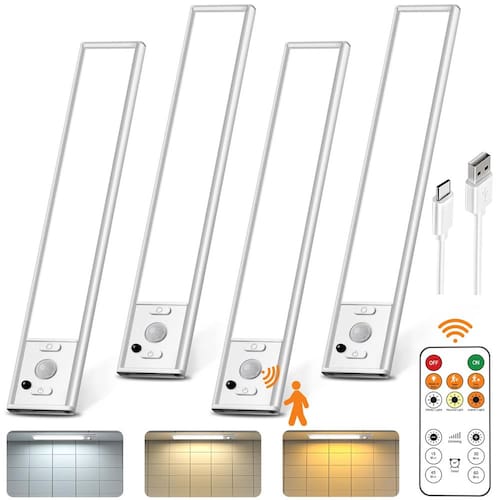 38 LED: as luzes LED de cozinha para iluminação embaixo do armário incluem 38 contas de LED que emitem 180 lúmens de luz branca difusa suave. Fornece luz suficiente para iluminar todos os cantos escuros. Três modos com controle remoto: modo sempre ligado, modo de sensor de movimento, modo desligado. Modo sempre ligado: a luz recarregável USB do armário fornecerá holofotes onde e quando você precisar. Você pode usá-lo durante o dia ou à noite Luzes LED recarregáveis Modo de sensor de movimento: a luz noturna recarregável do sensor de movimento acenderá automaticamente quando o movimento humano for detectado dentro de 120° e 10 pés e desliga automaticamente após cerca de 25 segundos sem movimento detectado. Não precisa mais se preocupar em tropeçar no degrau no escuro tentando ligar o interruptor. NOTA: Este recurso funciona apenas em ambientes escuros ou com pouca luz. Brilho ajustável: você também pode ajustar o brilho de 10% a 100% pressionando o botão no controle remoto, que pode ser operado dentro de 5 metros. Bateria recarregável: bateria recarregável de 1800 mAh embutida e conveniente porta de carregamento USB-C. Sem substituição de bateria. Sem fiação ou perfuração. Mais fácil de instalar do que um soquete de luz: 2 formas de instalação: através de ímãs embutidos ou placas de metal adesivas, você pode montá-las sob o armário sem fio em superfícies de ferro e outras superfícies limpas e planas. - ?Detecção de movimento inteligente com 3 modos de trabalho?Este sensor de movimento possui 3 modos automáticos. [Modo diurno] ativa ao detectar movimento, durante o dia ou a noite; [Modo noturno] responde apenas à luz escura. [Modo sempre ligado] as luzes do armário com sensor de movimento acenderão quando o movimento for detectado dentro de um alcance de 120° e 3 metros. Todos os modos desligam automaticamente após 25 segundos sem movimento, garantindo o uso eficiente de energia. - ?4 temporizadores, 3 temperaturas de cor e 6 níveis de regulação?Esta iluminação sob armário com controle remoto de até 5 metros permite personalizar o brilho das luminárias sob o balcão de 10% a 100% em configurações de brilho de 6 níveis, que você pode definir para 4 configurações de tempo de 15 min/30min/45min/60min. Para proteger seus olhos, as cores de iluminação embaixo do armário são projetadas como branco quente 2700 K, branco neutro 4000 K e branco luz do dia 6500 K. Nossa luz embaixo do armário sem fio reduz o brilho, fornecendo a luz certa para cada tarefa, desde como uma luz sob o balcão para preparação da cozinha até uma luz noturna com sensor de movimento. - ?Bateria recarregável USB-C sem fio? Esta luz LED recarregável para armário possui uma bateria recarregável de 1800 mAh e pode ser facilmente recarregada via cabo tipo C. uma carga completa pode durar de 50 a 70 dias no modo automático e de 9 a 10 horas no modo sempre ligado com 100% de brilho. - ?Fácil de instalar?Nossas luzes para armários na cozinha com ímãs fortes embutidos, a instalação é rápida e simples — sem necessidade de ferramentas ou eletricistas. Prenda a qualquer superfície de metal ou use as placas de metal com fita adesiva de dupla face fornecidas para colocar a luz onde você precisar. O design magnético também facilita o carregamento — basta retirar e reconectar. Elas são perfeitas sob o balcão de luzes magnéticas para cozinhas, armários, porões, escadas, estantes, iluminação externa de trailers e muito mais. - ?Presente e garantia perfeitos? A embalagem requintada é uma ótima opção para um presente de decoração de casa, e também adequada para presente de Dia das Mães, presente de Dia dos Pais, casamentos, aniversário, inauguração de casa, Ação de Graças e Natal. Se a luz do armário tiver algum problema de qualidade, diretamente e forneceremos uma solução satisfatória. Nós realmente nos preocupamos com a experiência de compra de todos os clientes!