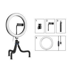 Especificações Técnicas: Marca: Apexel Modelo: APL-FL10JJ10Y Material: ABS + aço inoxidável Quantidade de Leds: 120 Diâmetro externo: 26cm / 10 polegadas Diâmetro interno: 20cm Potência: 8-10W Níveis de ajuste brilho: 10 Tipos de cor da luz: 3 Temperatura da cor: 3000K a 6500K Voltagem: 5V Suporte de celular: de 6,7 até 9,5cm Altura Tripé: aproximadamente 29cm Altura Tripé fechado : 31cm