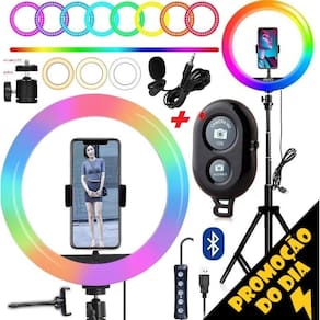 Iluminador ring light anel luz led colorida rgb vdeo profissional 26cm tripé suporte celular bluetooth microfone lapela Kit com eletrônica Kit ring light rgb colorido + tripé 2,10m + microfone lapela acompanha controle disparador bluetooth Com este modelo você consegue usar o celular tanto na vertical quanto na horizontal Possui também ball head permite rotação de 360º do ring Ring light 10 polegadas rgb O ring light led rgb possui 6 tipos de cores, tem 3 opções de temperatura de cores e 10 opções de intensidade da cor, podendo ser alternados direto no controle de iluminação, os efeitos podem ser de acordo com diferentes ambientes de escurecimento. Também possui as cores tradicionais -branco -branco frio -branco quente Com o ball head em rotativa de 360 graus é fácil de ajustar o ângulo de luz desejado Sua alimentação é atraves do usb que pode ser em computador host, laptop, banco de energia móvel ou ligado na tomada através de um adaptador de celular não acompanha O ring light é perfeito para streaming , estudos, fotos, video, filmagem e muito mais. Características do produto: . Possui controle remoto com fio para controle das cores e efeitos desejados em seus ambientes, vídeos e fotos; . Possui tripé de 2,10 cm de altura, super resistente que proporciona maior estabilidade para o equipamento; Está incluso também o suporte pra colocar o celular no meio do ring light Dimerizável: sim Tamanho do ring light: 26 cm - equivalente a 10 polegadas Possui suporte para celular: sim Microfone de lapela profissional para profissionais exigentes que buscam melhorar a qualidade seus vídeos sem um alto investimento. Microfone para uso em celulares sem necessidade de uso de adaptadores. Características: - alta sensibilidade, alta dinâmica, ampla resposta de freqência. - clipe giratorio permite que você prenda facilmente em sua gola, gravata ou no bolso. - uma tampa de espuma protege seu microfone do ruído do vento e cuspir. - portátil com tamanho de cabo de 1,5 metros. - ótimo para áudio na gravação de vídeos, entrevistas , podcasts... Controle remoto bluetooth celular É um produto que foi desenvolvido para facilitar a vida dos usuários de smartphones que adoram tirar aquela selfie sozinho ou com a galera. Com ele, você pode facilmente tirar fotos ou fazer vídeos sem precisar tocar no seu aparelho Atenção a cor do controle bluetooth é escolhida aleatoriamente, conforme a disponibilidade em Itens inclusos: 1 ring light 10 polegadas 26cm 1 tripé profissional com 2,10m de altura 1 ball head permite rotação de 360º do ring 1 suporte para celular 1 controle de intensidade e troca de temperatura embutido no fio 1 microfone de lapela profissional 1 controle bluetooth para fotos e vídeos Melhor kit custo benefício.