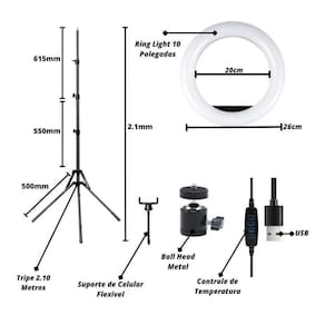 Embalagem contém: 1 - Ring Light 10 (26cm); 1 - Adaptador de celular; 1 - Tripé (altura máxima de 2,1m); 1 - Controle de intensidade de iluminação.