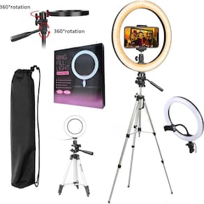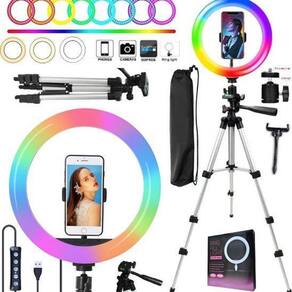 Iluminador ring light luz led colorida rgb para foto profissional maquiagem + tripé suporte celular smartphone universal Kit Legítimo com nota fiscal eletrônica Kit iluminador ring light rgb colorido + tripé 1,20m profissional Com este modelo você consegue usar o celular tanto na vertical quanto na horizontal Possui também ball head (permite rotação de 360º do ring) Ring light 10 polegadas rgb O ring light led rgb possui 6 tipos de cores, tem 3 opções de temperatura de cores e 10 opções de intensidade da cor, podendo ser alternados direto no controle de iluminação, os efeitos podem ser usados de acordo com diferentes ambientes de escurecimento. Também possui as cores tradicionais -branco -branco frio -branco quente Com o ball head em Elemento rotativa de 360 graus é fácil de ajustar o ângulo de luz desejado Sua alimentação é atraves do usb que pode ser usado em computador host, laptop, banco de energia móvel ou ligado na tomada através de um adaptador de celular ( não acompanha) O ring light é perfeito para streaming ao , estudos, fotos, video, filmagem e muito mais. Características do produto: . Possui controle remoto com fio para controle das cores e efeitos desejados em seus ambientes, vídeos e fotos; . Possui tripé de 1,20 cm de altura, super resistente que proporciona maior estabilidade para o equipamento; Está incluso também o suporte pra colocar o celular no meio do ring light Dimerizável: sim Tamanho do ring light: 26 cm - equivalente a 10 polegadas Possui suporte para celular: sim Itens inclusos: (1) ring light 10 polegadas (26cm) (1) tripé profissional com 1,20m de altura (1) ball head (permite rotação de 360º do ring) (1) suporte para celular (1) controle de intensidade e troca de temperatura (embutido no fio) Melhor kit custo benefício.