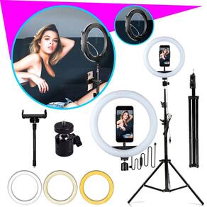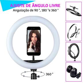 Iluminador de LED Ring Light - 10 polegadas. Agora Seus Vídeos e Fotos vão ficar profissionais com este Incrível Ring Light 10 Polegadas. Iluminador Profissional com tecnologia LED Ideal para todos os tipos de fotografia, maquiagem e estética. Se adapta a qualquer necessidade de iluminação, luz linear e sem sombras. Ring light led é um iluminador com ajuste de até 10 níveis de intensidade de luz. Possui 03 tonalidades de cor branca. Alimentado através de um cabo USB, devendo estar sempre conectado a uma fonte de energia para acender. Características: - Tripé ajustável - 3 Tipos de cores: Branco frio, branco neutro e branco quente; - Entrada do produto USB é compatível com fonte de celular. Especificações Técnicas: Embalagem contém: - Ring Light 10 26cm ; - Adaptador de celular; - Tripé altura máxima de 2,1m ; - Controle de intensidade de iluminação no cabo Importante Utilizar fonte de energia de no máximo 5W a 9W para não danificar o produto. 90 dias pelo fabricante Ean: 7895141232761