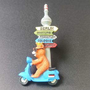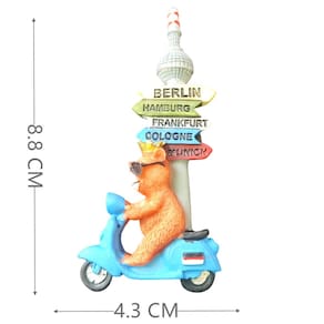 Material: Resina Tamanho: 4,3x8,8 cm Peso: 50gFun Berlin Design: este ímã de geladeira apresenta um lindo urso usando óculos escuros e dirigindo uma scooter com sinais direcionais para várias cidades alemãs, adicionando um toque divertido à famosa Torre de TV de Berlim. Artesanato em resina de alta qualidade: feito de resina durável, o ímã mostra detalhes intrincados, incluindo as cores e texturas vibrantes do urso, da scooter e do marco de Berlim. Lembrança alemã: uma lembrança perfeita de Berlim, representando a icônica Torre de TV da cidade e o espírito alegre das viagens alemãs, ideal para quem ama a Alemanha. Decoração criativa: ideal para adicionar um toque divertido e colorido à decoração de sua cozinha, escritório ou casa, trazendo a energia dos marcos e da cultura da Alemanha para o seu espaço. Compacto e leve: medindo 4,3 x 8,8 cm e pesando 50 g, esse ímã é fácil de colocar em qualquer superfície magnética, tornando-o uma adição encantadora a qualquer coleção.