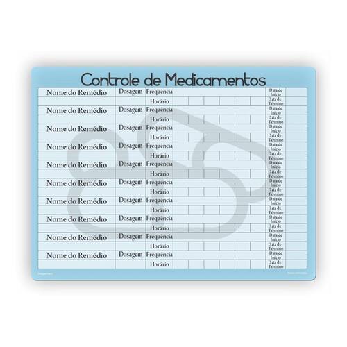 Painel magnético para anotações de horários e controle de medicamentos. Produto confeccionado com manta magnética de 0,8 mm + vinil branco impresso + vinil incolor de laminação. Para uso com marcadores para quadro branco. Medida 40 cm x 30 cm. O produto segue com 1 caneta Azul + Recarga Azul. Recomendamos limpeza periódica com removedor. Marca: Não Informado