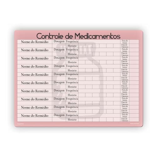 Painel magnético para anotações de horários e controle de medicamentos. Produto confeccionado com manta magnética de 0,8 mm + vinil branco impresso + vinil incolor de laminação. Para uso com marcadores para quadro branco. Medida 40 cm x 30 cm. O produto segue com 1 caneta Azul + Recarga Azul. Recomendamos limpeza periódica com removedor. Marca: Não Informado