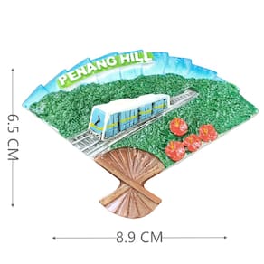 Material: Resina Tamanho: 8,9 x 6,5 cm Peso: 50 gDesign icônico de Penang Hill: apresenta um design exclusivo em forma de leque com uma imagem 3D de um trem viajando por uma vegetação exuberante, destacando a beleza de Penang Hill. Material de resina durável: feito de resina de alta qualidade, este ímã foi projetado para durar e trazer um pedaço de Penang para sua casa. Lembrança perfeita: uma lembrança criativa e memorável da Malásia, perfeita para colecionadores ou para quem adora viajar. Decoração versátil: ideal para geladeiras, armários, quadros brancos e outras superfícies magnéticas em sua cozinha, escritório ou sala de estar. Compacto e leve: medindo 8,9 x 6,5 cm e pesando apenas 50 g, é o tamanho perfeito para facilitar a exibição sem sobrecarregar seu espaço.